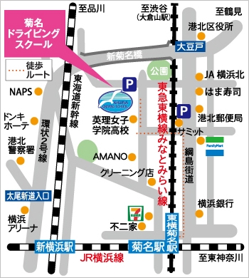 菊名ドライビングスクールは菊名駅からも大倉山駅からも歩いて約9分。 新横浜駅からも一番近い自動車学校です。 静かな住宅街の中にある教習所ですから、お子様連れの方も安心して通うことができます。 また、駅から教習所までの道も平地ですから、自転車でも通えます。