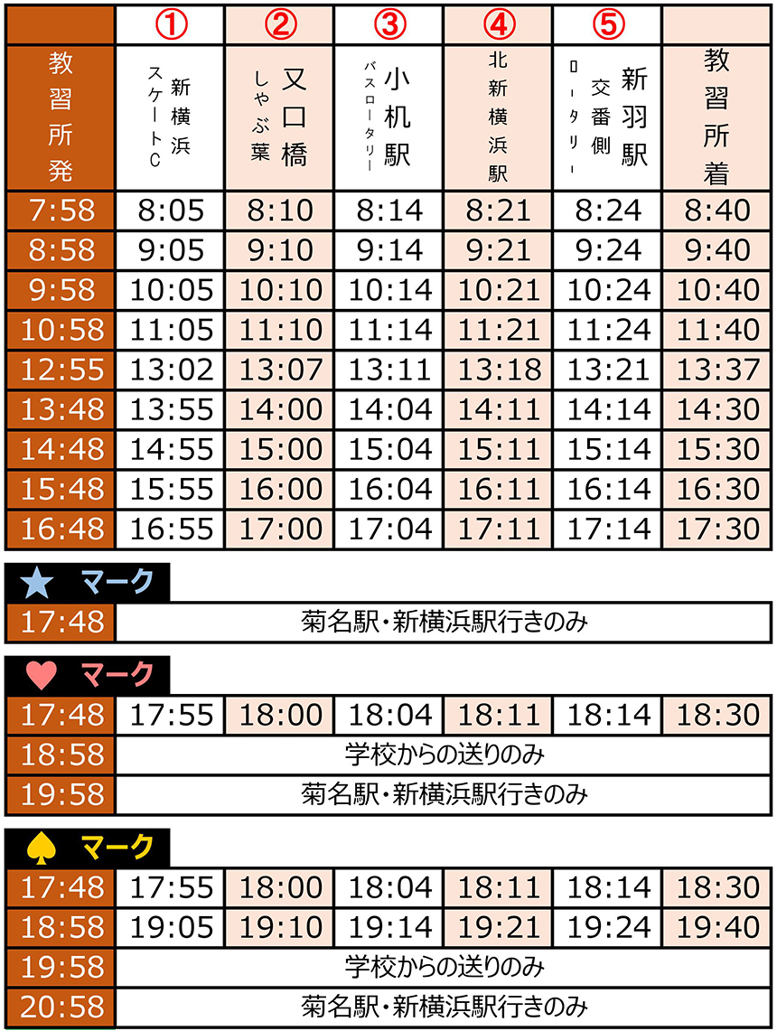 ※詳細につきましては入校時にお尋ねください。 - スクールバスの遅延や乗車できなかった場合等での交通費(電車・バス・TAXI/駐車代等)を当校が負担することは⼀切ございません。あらかじめご了承の上、ご利用ください。