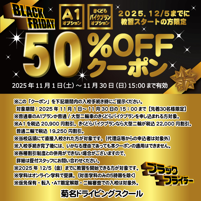 50%OFFクーポン! 普通車A1プラン・二輪車きくどらバイクプランのオプション料金が【半額】