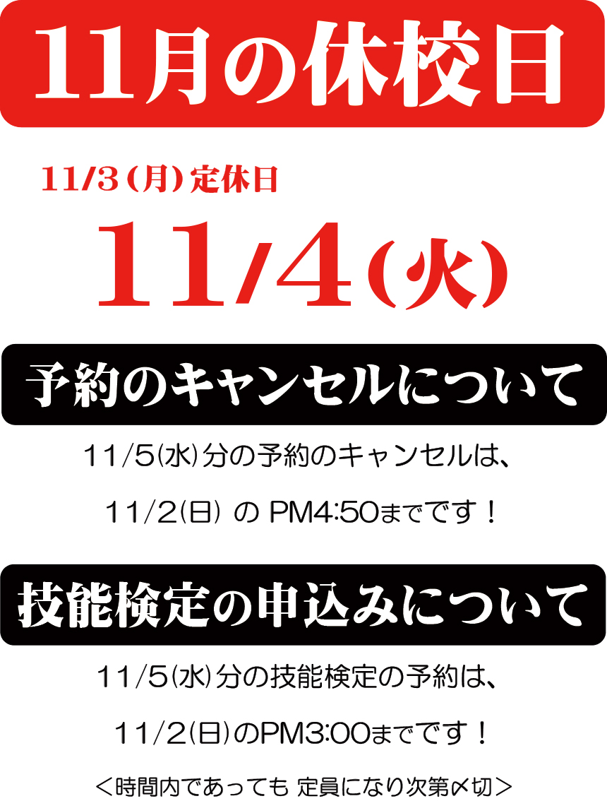 11月は、11/4(火)が休校日となります。 検定申込やキャンセル受付の締め切り時間が以下のように変わりますのでご注意ください。