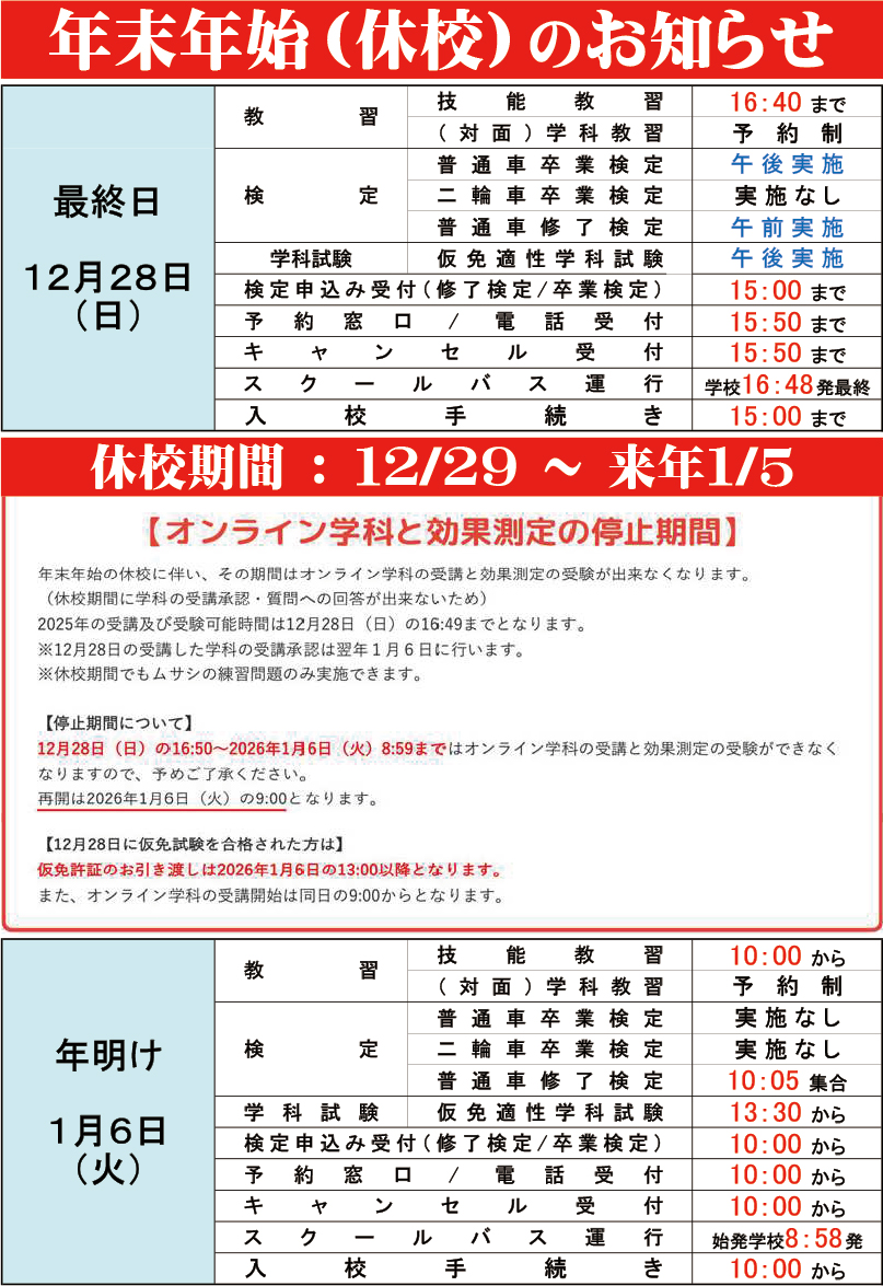 年末年始の休校に伴い、その期間はオンライン学科の受講と効果測定の受験が出来なくなります。