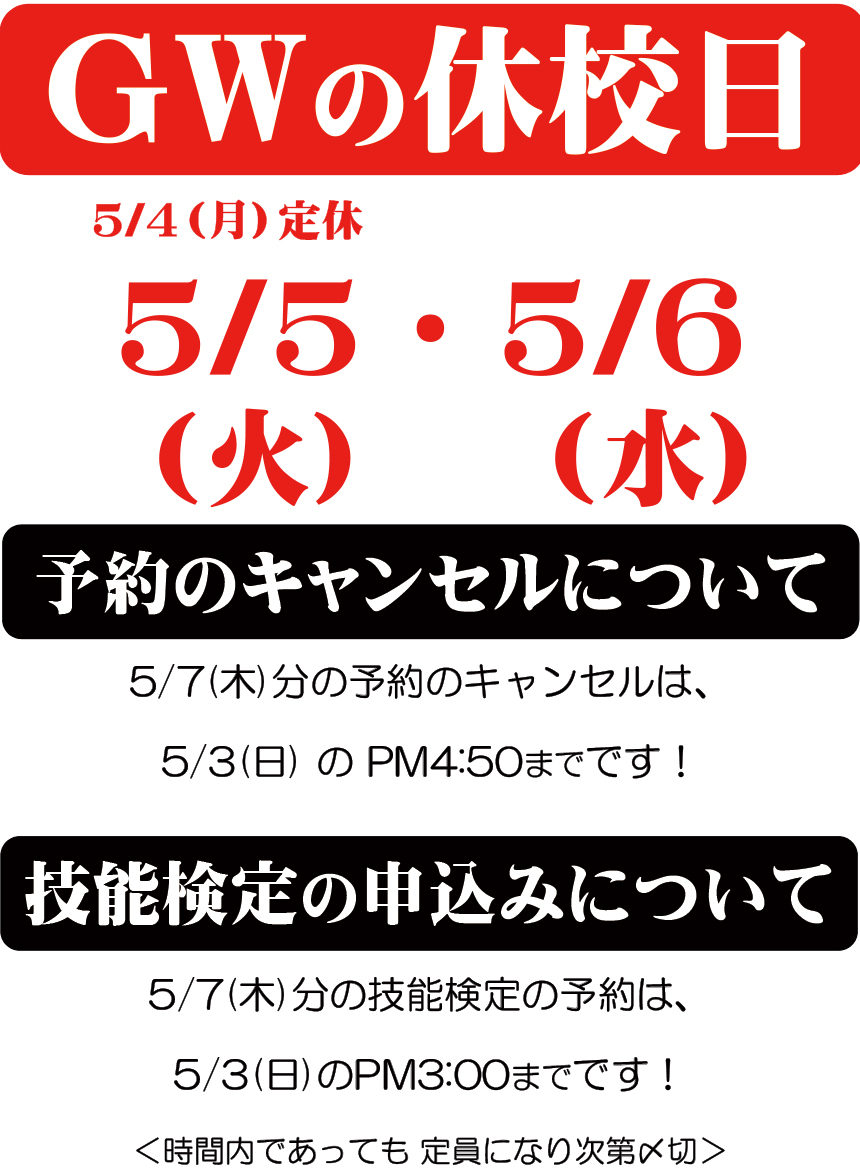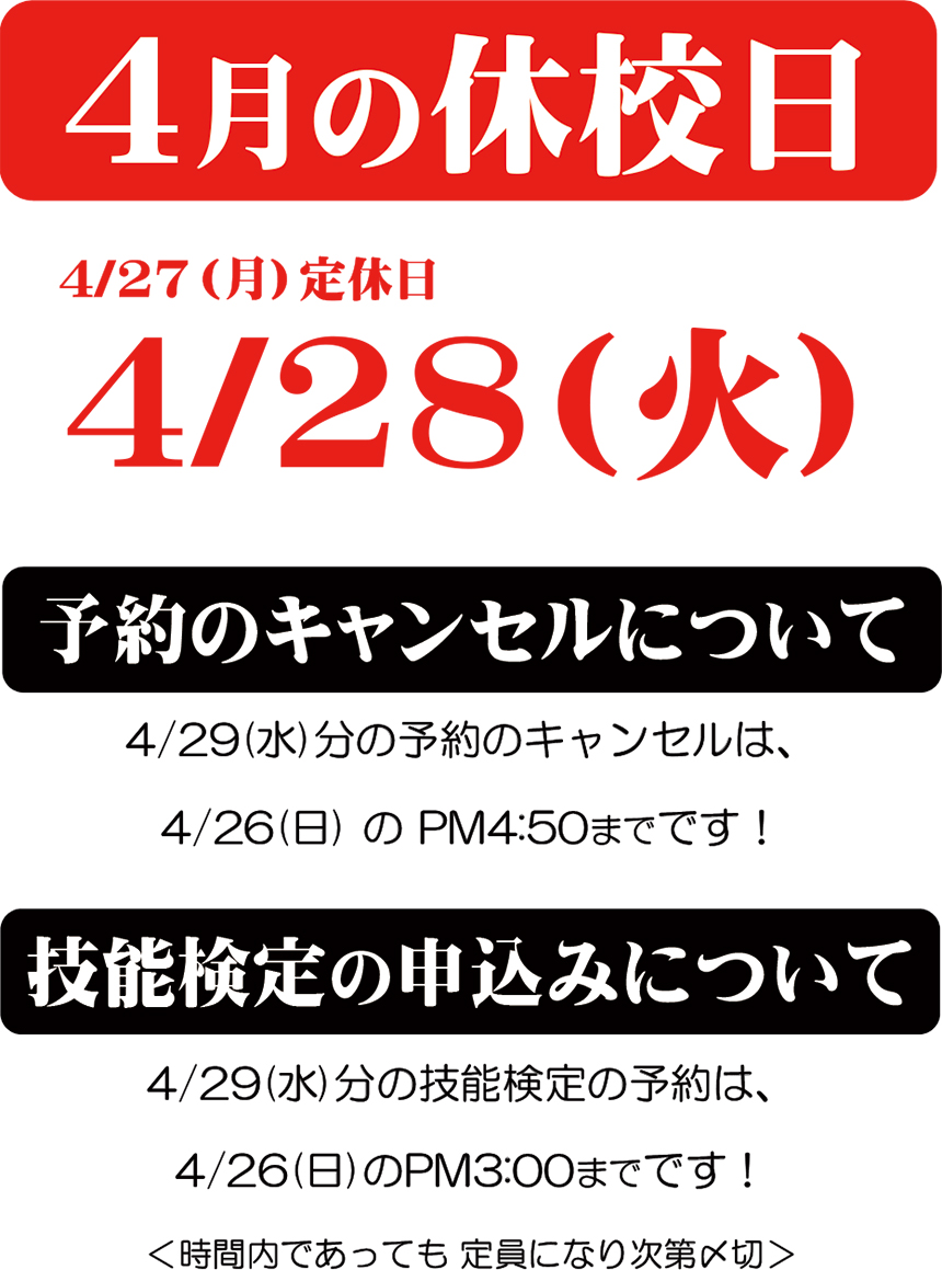 4月および5月は、4/28(火)・5/5(火)・5/6(水)が休校日となります。 検定申込やキャンセル受付の締め切り時間が以下のように変わりますのでご注意ください。